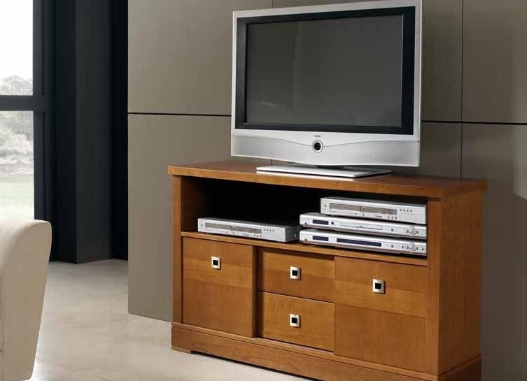 Satu lagi varian menarik di bawah TV ialah laci dengan laci. Di rak kabinet ini diletakkan TV, pemain DVD, pusat muzik, dan kotak - cakera, majalah, buku, album foto.